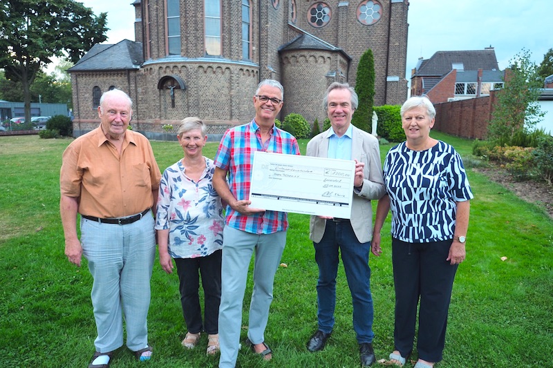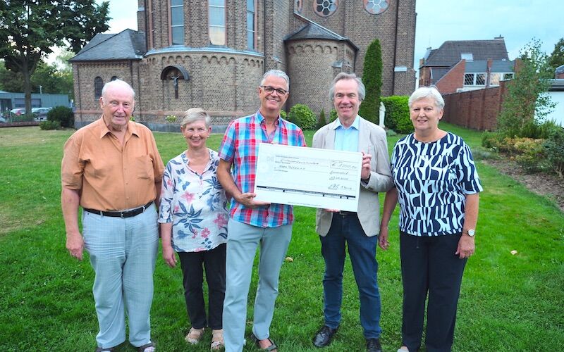 Chorleiter Peter Heinrichs und die Vorsitzende des Kirchenchors Petra Hennig überreichten Elisabeth Rehmann, Dr. Wolfgang Lerch und Werner Weiland vom Vorstand des Hospizvereins den Spendenscheck.