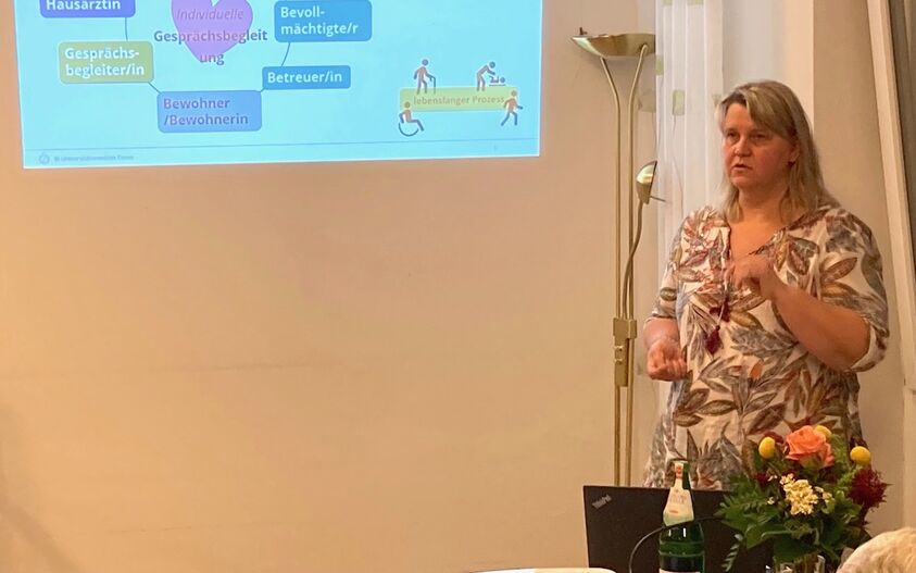 In diesem Zusammenhang stellte Catrin Beu das Konzept „Behandlung im Voraus planen“ vor, das das Ziel verfolgt, Entscheidungen über lebenserhaltende Maßnahmen im Vorfeld durch qualifizierte nicht-ärztliche Gesprächsbegleitung zu klären und zu dokumentieren.