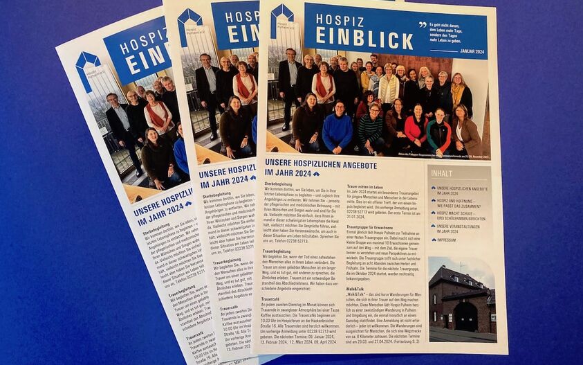 Anfang Januar ist ein neuer Newsletter von Hospiz Pulheim e.V. erschienen. Er enthält einen Überblick über die hospizlichen Angebote dieses Jahres, den Erfahrungsbericht einer ehrenamtlichen Sterbebegleiterin unter dem Thema „Hospiz und Hoffnung – wie passt das zusammen?“, die Eindrücke von drei Schülerinnen in der Projektwoche „Hospiz macht Schule“ und die Veranstaltungen 2024. Der Newsletter steht hier zum Download bereit: