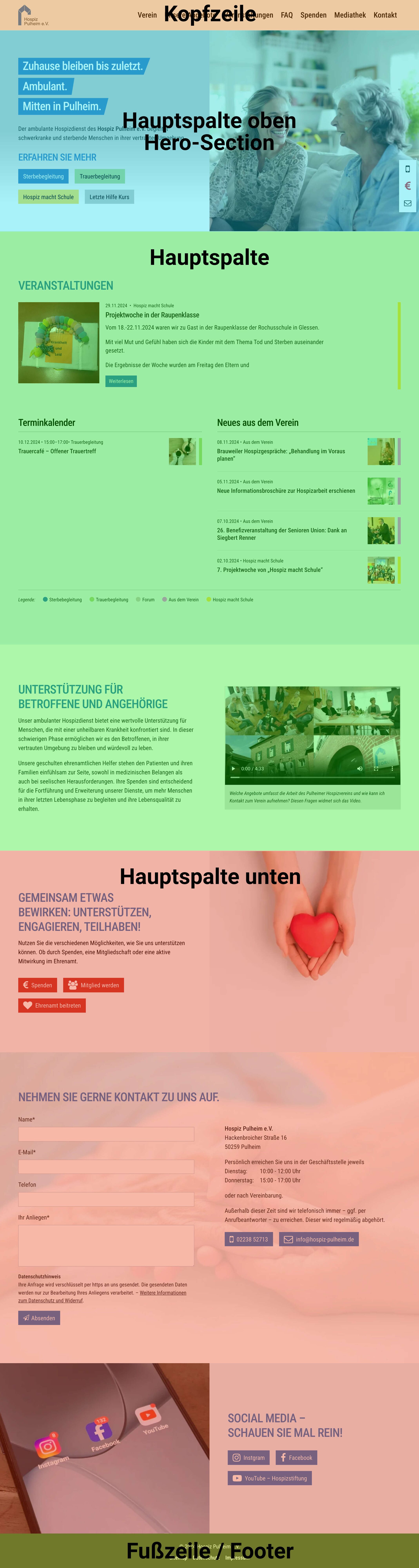 - Hauptspalte unten – Spendenbereich, Kontaktformular, Social Media