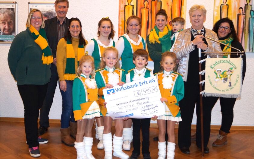 Mit einer guten Nachricht überraschte die Jugendabteilung der KG Ahl Häre den Pulheimer Hospizverein gleich zum Jahresbeginn: Bei einem vorweihnachtlichen Fotoshooting mit den Kindern der Tanzgruppe war ein beachtlicher Spendenbetrag zusammengekommen. Die Fotografin Claudia Rambach (ClaRa) hatte das Fotoshooting organisiert und die Eltern der Kinder konnten anschließend mit einer Spende ab 5 Euro die digitalen Bilder ihrer Kinder erwerben. Am 27. Januar 2023 überreichten Mitglieder der Jugendabteilung unter der Leitung von Susanne Miebach den Hospizvorständen Elisabeth Rehmann und Karl Heinz Bossier den Spendenscheck. Auch Fotografin Claudia Rambach war zusammen mit der Gruppe gekommen. Elisabeth Rehmann und Karl Heinz Bossier dankten allen Beteiligten herzlich für diese tolle Aktion.