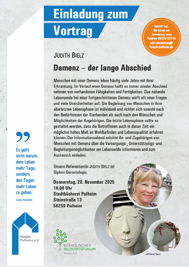 Menschen mit einer Demenz leben häufig viele Jahre mit ihrer Erkrankung. Im Verlauf einer Demenz heißt es immer wieder, Abschied zu nehmen von vorhandenen Fähigkeiten und Fertigkeiten. Das nahende Lebensende bei einer fortgeschrittenen Demenz wirft oft neue Fragen und viele Unsicherheiten auf. Die Begleitung von Menschen in ihrer allerletzten Lebensphase ist individuell und richtet sich sowohl nach den Bedürfnissen der Sterbenden als auch nach den Wünschen und Möglichkeiten der Angehörigen. Die letzte Lebensphase sollte so gestaltet werden, dass die Betroffenen auch in dieser Zeit ein möglichst hohes Maß an Wohlbefinden und Lebensqualität erfahren können. Der Informationsabend möchte An- und Zugehörigen von Menschen mit Demenz über die Versorgung-, Unterstützungs- und Begleitungsmöglichkeiten am Lebensende informieren und zum Austausch einladen.